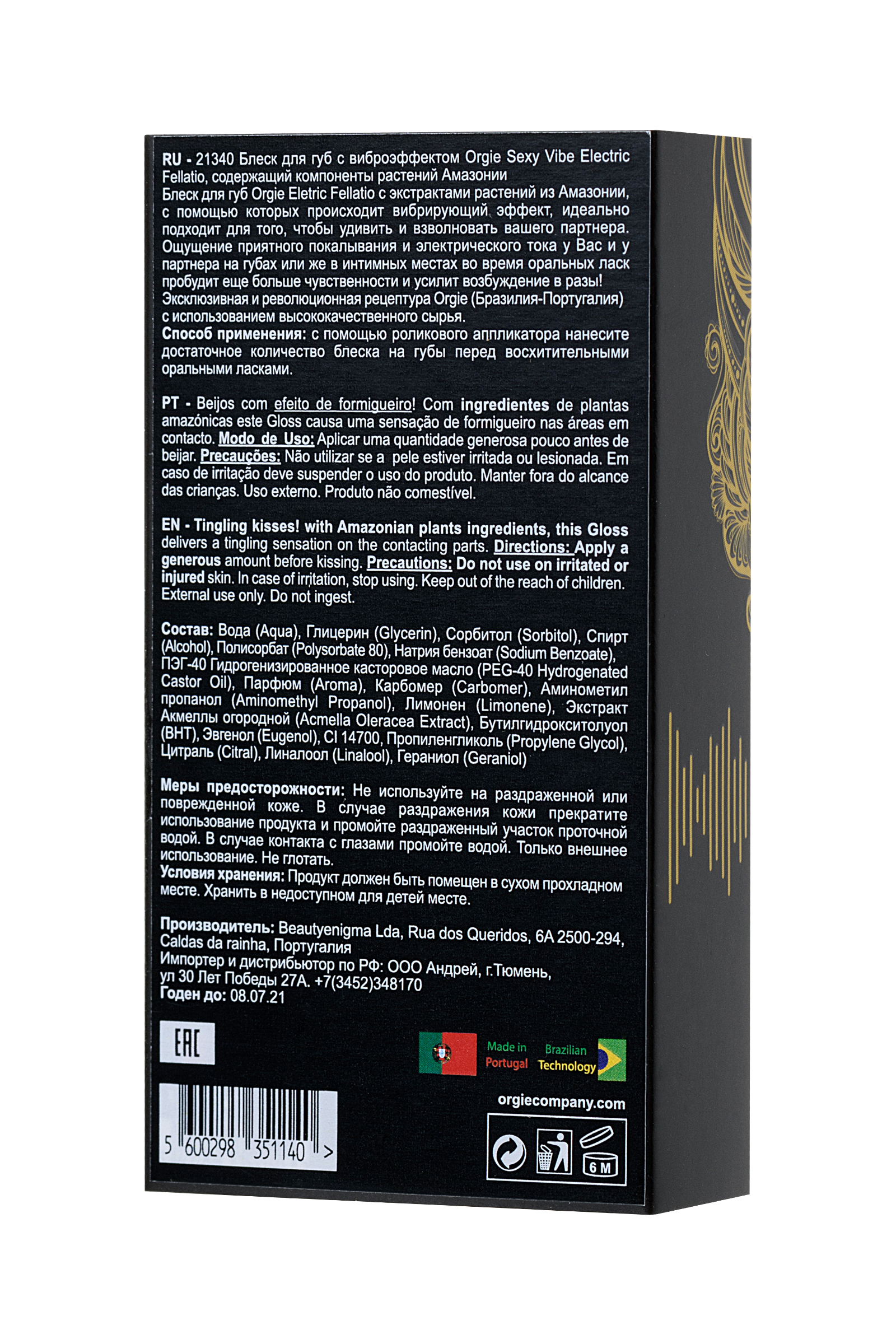 Могут ли поцелуи вызывать электрическую искру и страсть, подобную бразильской? Да, если их дополняет блеск для губ с вибрирующим эффектом Орджи Sexy Vibe Electric Fellatio. • Особенность блеска — состав из выжимки редких растений лесов Бразилии, благодаря которому на губах создается покалывающий и одновременно вибрирующий эффект. Это приятное ощущение легко передается партнеру при поцелуях, делая их возбуждающе притягательными и запоминающимися. • Блеск отлично увлажняет и питает кожу губ благодаря экстракту акмеллы в составе — цветку, который так любят жительницы жаркой Бразилии. При ежедневном использовании заметен лифтинг-эффект. • Блеск содержит только безопасные и качественные компоненты, не вызывающие раздражение даже на слизистой. А это значит, что ваши поцелуи могут быть максимально интимными. Подарите своим чувствам Orgie.
